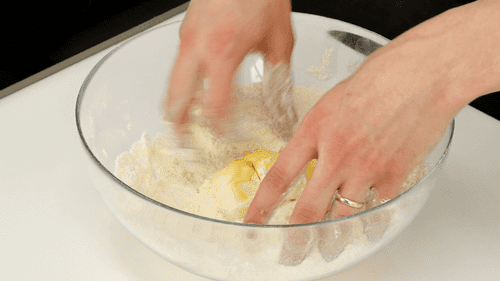 Mix dry ingredients with butter until crumbly. Gently toss the crumbs to incorporate air into the dough.