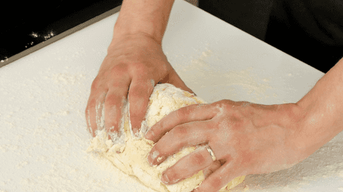 Make a well in the center of the flour and pour milk into it. Mix first with a spatula, then transfer the dough to a floured surface and knead gently.