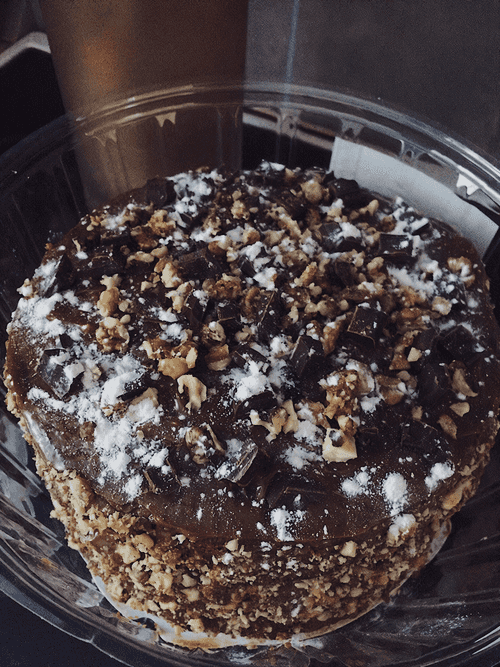 Spread the remaining cream on the top and sides. Decorate with nuts, chocolate crumbs, or any other ingredients.