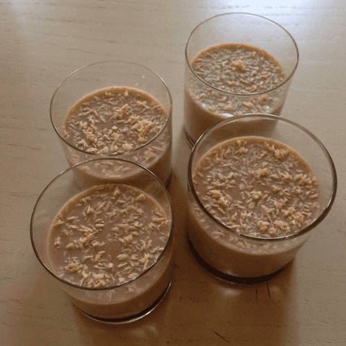 Heat the swollen gelatin in a water bath until dissolved, pour it into the yogurt-coffee mixture, mix well, pour into transparent molds, and refrigerate for several hours until set.