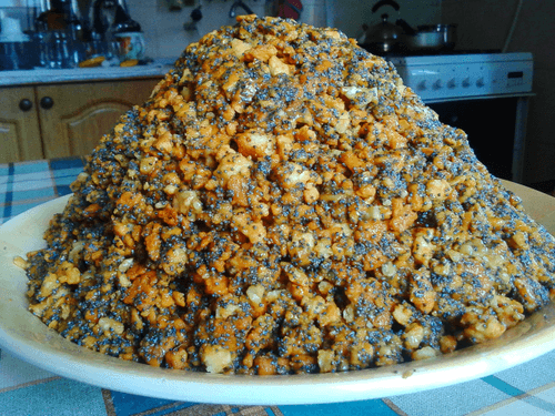 Break the ready cakes into small pieces and place them in a bowl. Also add poppy seeds and peanuts to taste.