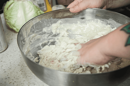 Add the flour. Always measure water and flour with the same or identical cups. The proportion is important here.