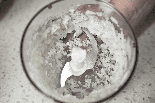 For the filling, peel the onion, place it in a blender bowl, and chop it.