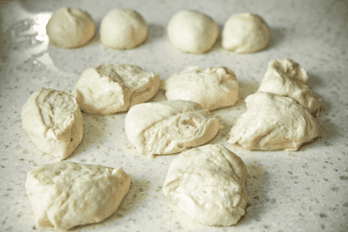 Place the risen dough on a lightly oiled table. Divide the dough into 12 equal parts.