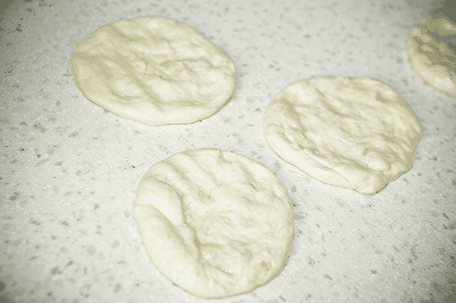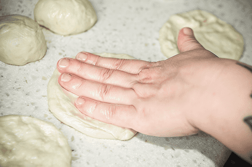 Take a ball of dough and flatten it with your palm into a small pancake.