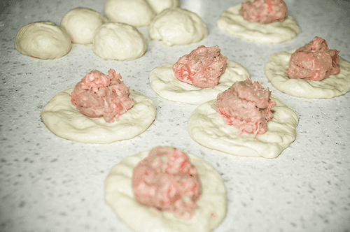 Add minced meat and half a teaspoon of salt to the onion. Mix with a blender. Divide the filling into 12 equal parts.