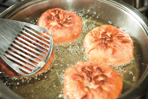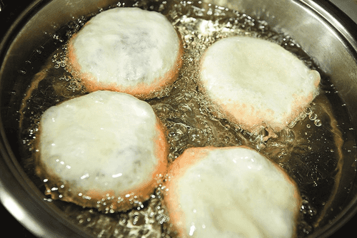 Prepare 4 or 6 flatbreads this way, depending on the number of meat pies going into the pan. Also, keep in mind that the dough will expand while frying. Place the pan over medium heat. Pour in oil. The oil should be at least 1 cm deep. After the oil heats up (2-3 minutes), reduce the heat to below medium.