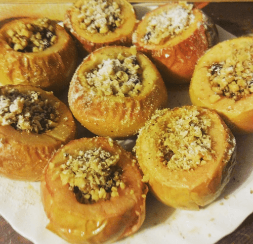We remove the caps and sprinkle each apple with walnuts and powdered sugar on top.
