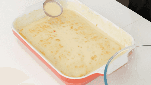 Mix the remaining milk, condensed milk, and concentrated milk, pour it over the pie so that it spreads evenly across the surface. Let it sit for 30 minutes.
