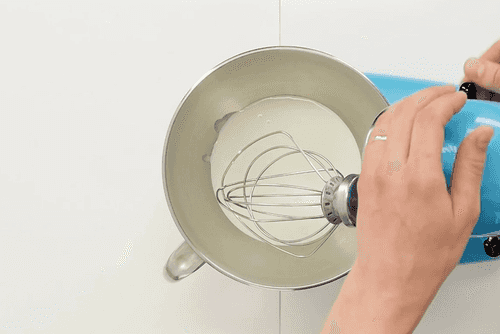 Whip the cream to soft peaks, then add powdered sugar and continue whipping to stiff peaks.