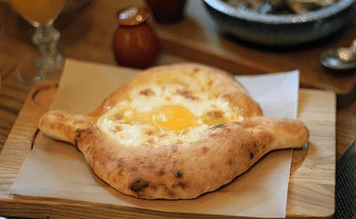Place cheese on the dough and 'seal' the edges to form the khachapuri into a 'boat' shape.