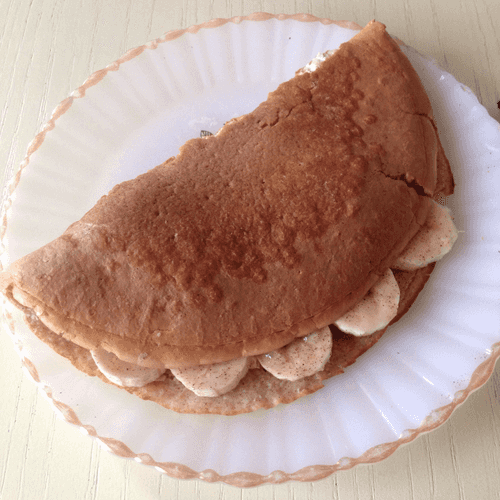 Spread yogurt on one side of the pancake, place sliced banana circles on half of it, sprinkle with cinnamon and drizzle with honey, then fold the other half of the pancake over.