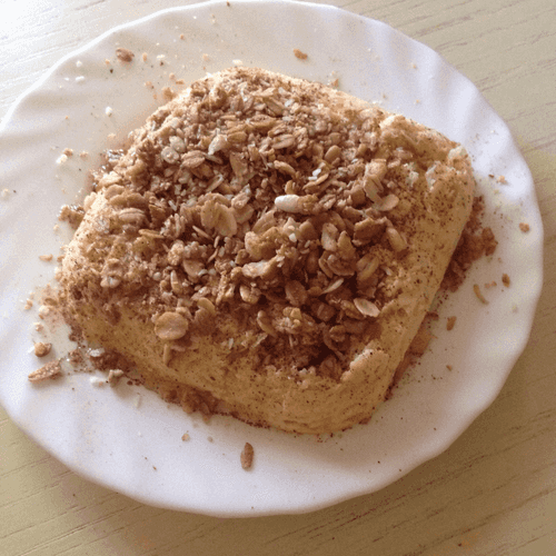 Remove the finished soufflé from the mold by flipping it onto a plate, drizzle with honey on top, and sprinkle with cinnamon (I also added 2 tablespoons of baked muesli).
