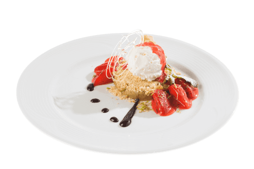 Rhubarb dessert with strawberry sauce is an exquisite blend of sweet and sour flavors and textures reminiscent of summer freshness. Rhubarb caramelized with sugar and butter takes on a tender, slightly tart softness that harmoniously complements the strawberry sauce enriched with basil and lime aroma. Shortbread adds a crunchy structure, while a scoop of vanilla ice cream gives the dessert a refined creaminess. A fragile caramel swirl and fresh mint garnish complete the composition, turning the dish into a true gastronomic masterpiece. This dessert is perfect for summer evenings when you want to enjoy a light, refreshing treat with a delicate interplay of flavors and textures.