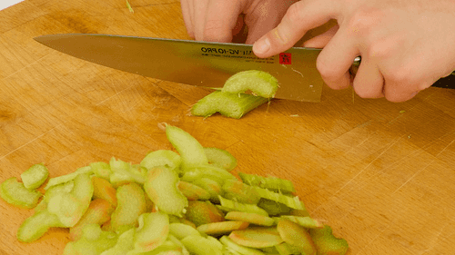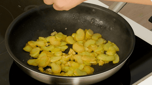 Pour 35 g of sugar into a pan and let it melt, then add butter and rhubarb. Sauté, stirring, until soft. Transfer the cooked rhubarb to a bowl and place it on ice to stop the cooking.