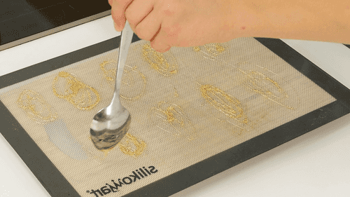 Pour 50 g of sugar into a saucepan and heat it with 20 g of water until golden brown, then immediately dip the saucepan into ice water for a few seconds to slightly cool the caramel. Use a spoon to pour the caramel onto a silicone mat, shaping it into curls. Let it cool completely.