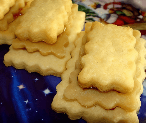 Slightly spread jam on a large cookie (any kind you like), place marzipan on top, add more jam, and cover with a small cookie, pressing down gently.
