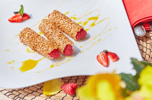 Place the tubes on a plate, garnish with mint and strawberries, and drizzle with the required amount of ginger sauce. Enjoy your meal!