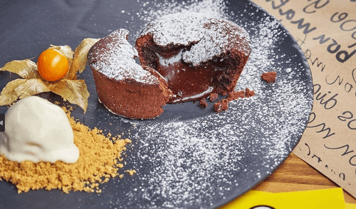 Chocolate flan is an exquisite dessert of French cuisine, embodying tenderness and rich flavor. Its history begins in the classic culinary traditions of France, where chocolate was valued for its sophistication. This dessert combines the intense taste of dark chocolate with an airy texture, creating a harmony of sweetness and lightness. Served hot alongside creamy ice cream that melts smoothly, enhancing the contrast of temperatures and aromas. Physalis and mint add freshness, while powdered sugar completes the composition with a light cloud of sweetness. Perfect as a conclusion to an exquisite dinner or romantic evening, offering delight in every bite.
