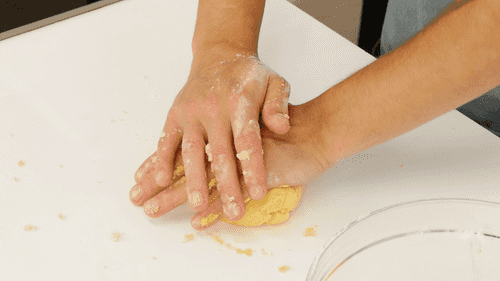 Shape the mass into a volcano, add the yolk in the center, and knead the dough, adding water. Wrap the dough in film and refrigerate for 30 minutes.