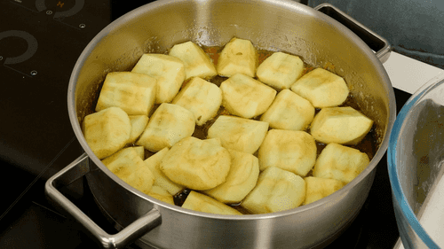 Place the apple halves tightly in the skillet with caramel. Return the skillet to the burner and heat for 5–10 minutes over high heat.