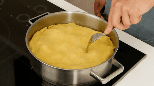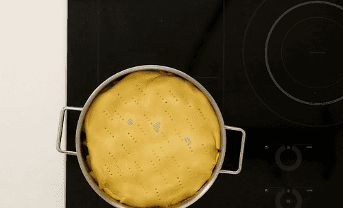 Cover the apples with dough, folding the edges inward into the mold. Make a small hole in the center of the pie to allow steam to escape.