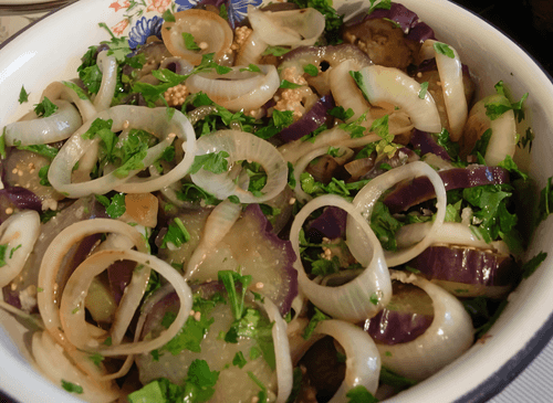 Pickled eggplants with onions