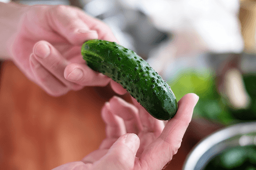 Cucumbers should be small and firm. Long Chinese cucumbers are not suitable; they are crunchy and juicy in salads but not good for pickling. Cucumbers should be thoroughly washed before pickling.