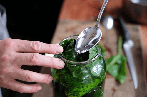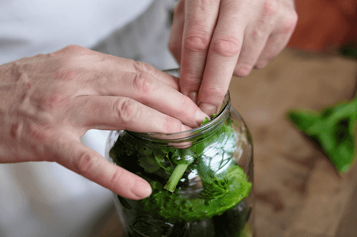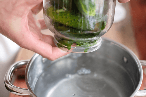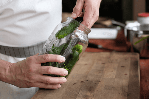 Place cucumbers in a jar; they can be packed with any density, but the more cucumbers fit in one jar, the fewer jars will be needed in the end.
