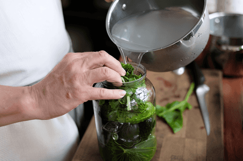 Add half a leaf of horseradish and several sliced rounds of the root. Besides disinfection, horseradish gives cucumbers strength and substance.