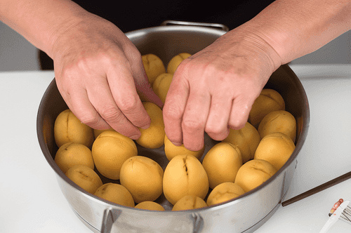 Place the apricots in the saucepan tightly, with the ends that had flowers facing up.