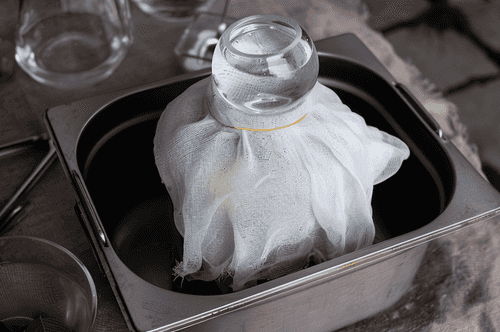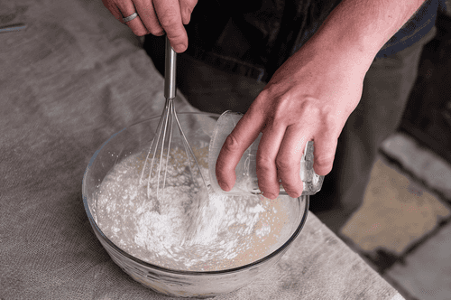 Take warm boiled water, rye flour, mustard powder, and coarse salt. Mix all of this in a bowl with a whisk. Clumps are acceptable; they will dissolve over time.