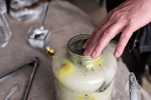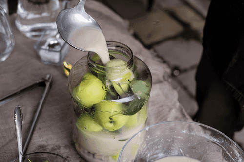 Cover the jar with clean cheesecloth and place a light weight on top; it shouldn't be too heavy. The purpose is not to compress the contents (which is important for sauerkraut, for example). The weight is needed to keep the apples submerged in water at all times. If the leaves on top start to mold, remove them and add new ones. There's no point in sealing the jar because fermentation begins inside. Some of the liquid will be absorbed by the apples while some will foam and overflow from the top. That's why you need to place the jar in another container. If a lot of liquid spills out, add more brine (so prepare extra). Keep adding until the apples stop absorbing liquid and it stops overflowing. At this point, you can remove the tray. The process of adding may take several weeks. If the brine runs out, prepare a new batch and pour it in.