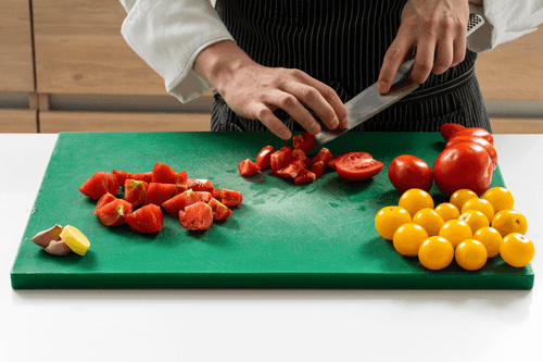 Cut the tomatoes into pieces: chop garden tomatoes coarsely, slice plum tomatoes thinner, and halve cherry tomatoes. Slice the garlic and peel the ginger, cutting it into 2-4 large pieces.