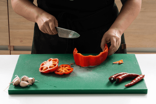 First, prepare the 'surprise' — a spicy filling that will later be hidden inside the tomatoes. For this, take one sweet pepper, cut off the tip and the bottom, and remove the seeds. Chop the pepper randomly and place it in a blender.