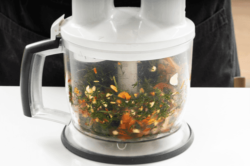 Add 5 cloves of garlic there (this depends on your love for spicy food; you can reduce or increase the amount of garlic). Set aside about a third of a large bunch of dill, chop the rest, and also put it in the blender.