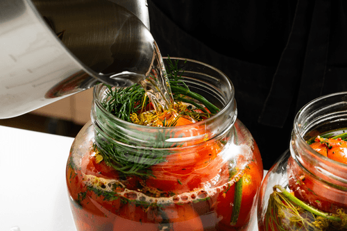 Place the tomatoes in a sterilized jar and add sprigs and umbrellas of dill.