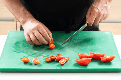 Blanch the tomatoes in boiling water, then transfer them to cold water and peel off the skin. Cut large tomatoes into wedges and small ones into halves.