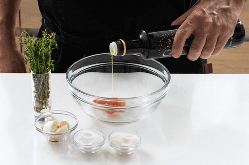 Place on a greased baking tray, add a few slices of garlic, thyme sprigs, and send to the dehydrator for 3 hours or to an oven preheated to 70 degrees for 6 hours.