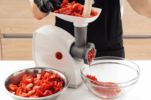Pass tomatoes, bell peppers, chili, and garlic through a meat grinder.
