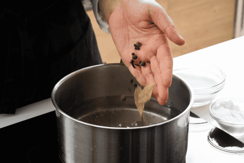 Prepare the marinade: add salt, sugar, allspice, black pepper, cloves, mustard, and bay leaf to water.