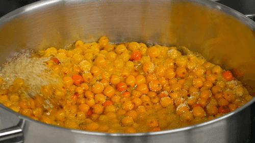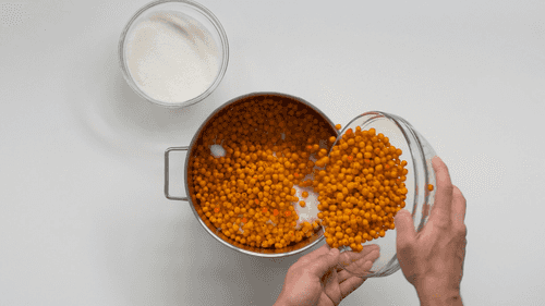 Layer sea buckthorn and sugar in a pot. Leave for 5 hours to let the berries release their juice.