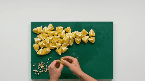 Wash the lemons, dry them, and cut into large pieces with the peel. Remove the seeds; otherwise, they will add bitterness and crunch unpleasantly in your teeth.