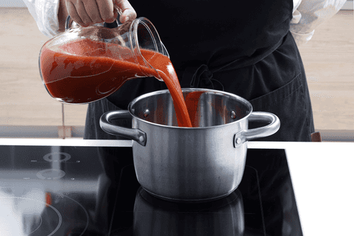 While the juice is heating, cut the tomatoes (small ones in half, large ones into quarters). Add them to the pot.