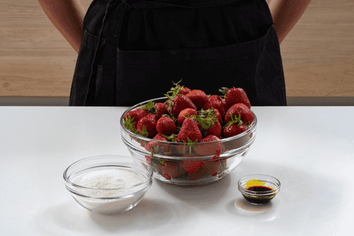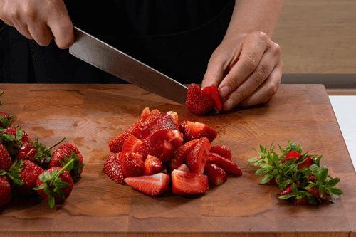 Cut the stems off the strawberries with a knife. Slice into quarters.