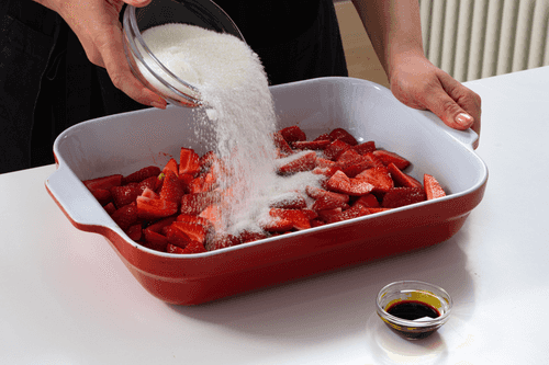 In a ceramic baking dish, mix strawberries, sugar, and vanilla extract.