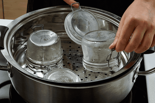 Sterilize jars over steam for 15 minutes. You can use a regular pot of boiling water and a strainer for this.