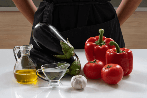 Fry the vegetables on all sides until soft. The tomatoes will be ready first, and the eggplants last.