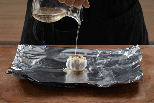 Cut the top off the garlic, place the head in foil, drizzle with oil, and wrap tightly.