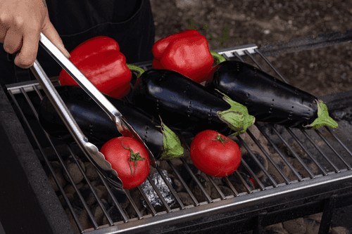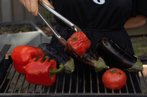 Throw garlic into the coals. Place eggplants, peppers, and tomatoes on the grill.